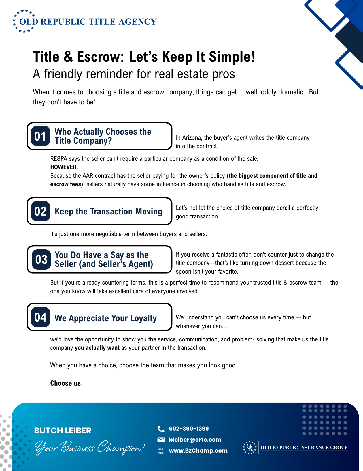 That's what I offer: real estate experience combined with the rock-solid backing of Old Republic Title. No fluff, no hassle—just reliable service that makes your job easier.